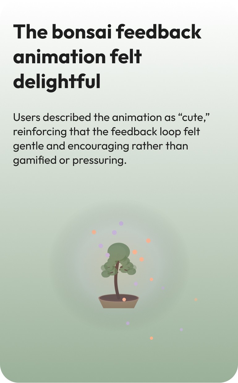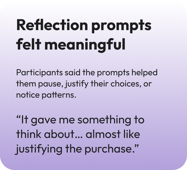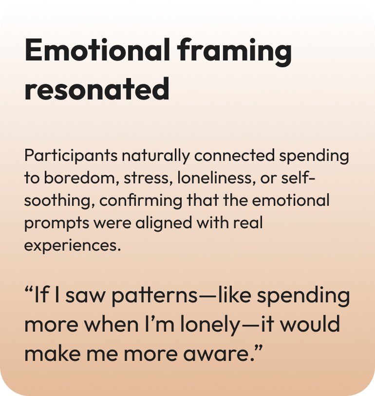Testing validated the emotional and reflective approach, but surfaced an important need: the app must explain, immediately and repeatedly, that it is not a budgeting tool and not meant for logging every expense.