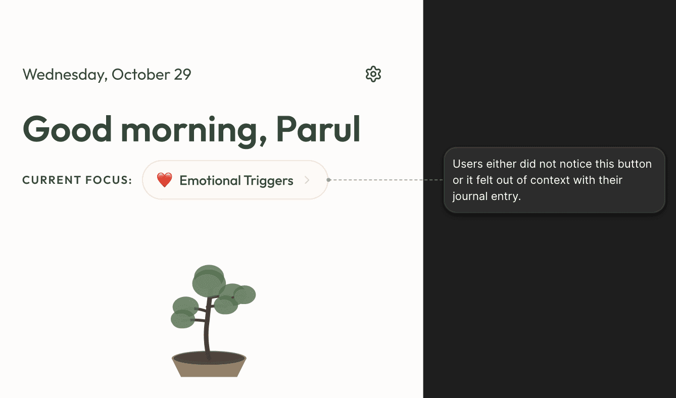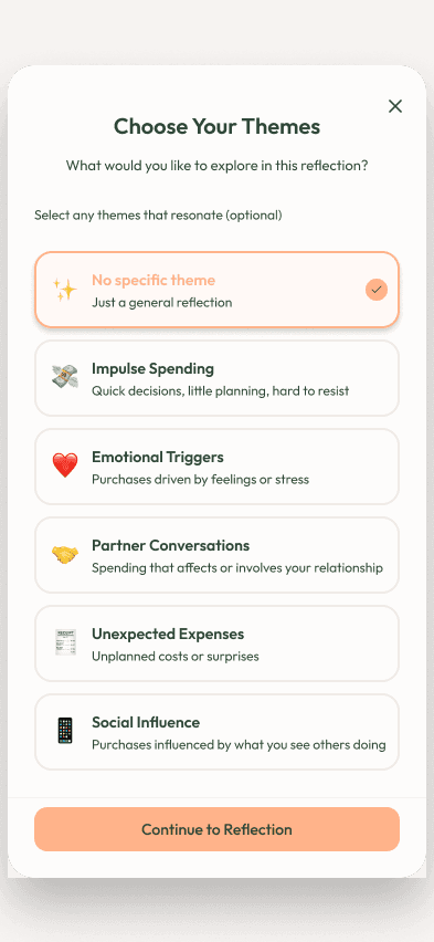 Reflection Focus Areas were misunderstood | Users overlooked the selector, didn’t understand how it affected prompts, and felt some focus areas overlapped. | Removed the selector and introduced optional tags (e.g., Impulse, Mood, Social Influence, Partner Communication). Tags allow multiples and match users’ mental models. |