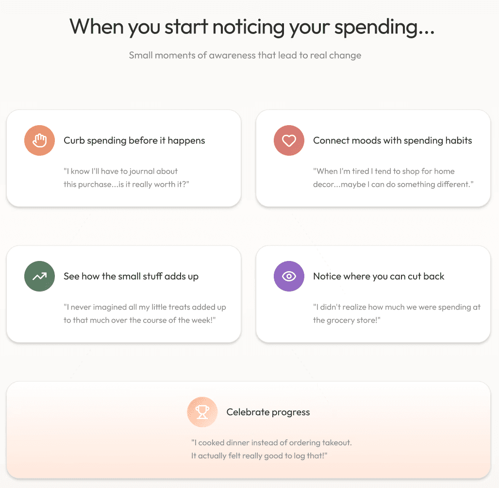 Traditional budgeting apps often overwhelm users with data (and guilt - you exceeded your dining out budget AGAIN). We posited that behavior change starts with awareness, not analytics - this has been proven to be true for food journaling and weight loss - does it also apply to discretionary spending habits?