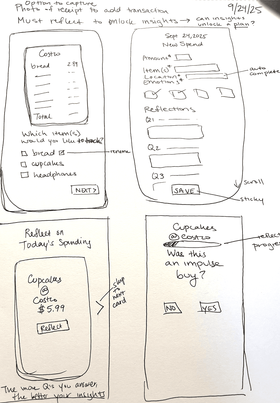The app concept my colleague had started already focused on discretionary purchases and "no-spend days"; bank linking was intentionally excluded to minimize friction and privacy risk. However, early testing he had conducted with potential users met the common refrain: "I don't want to have to input all of my transaction data!" Clearly we needed to reduce friction and make the journaling experience feel less like boring data entry.