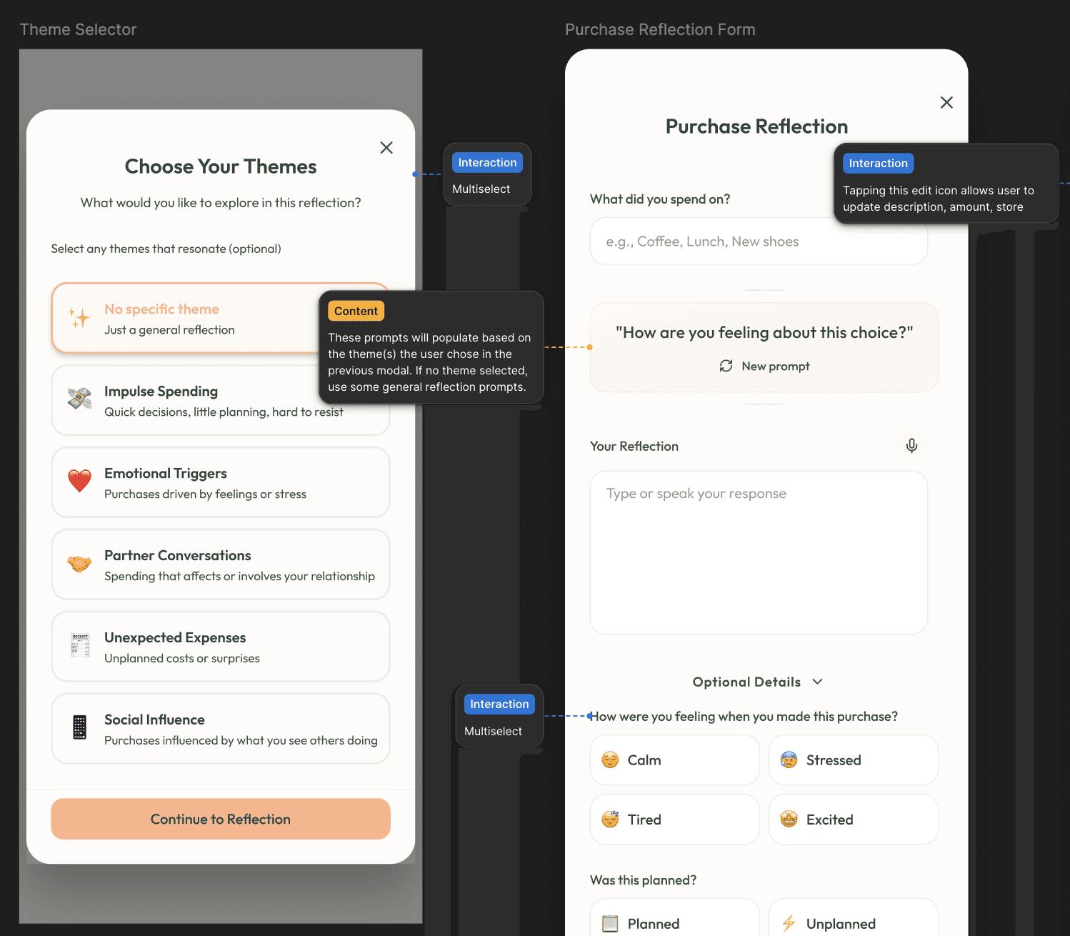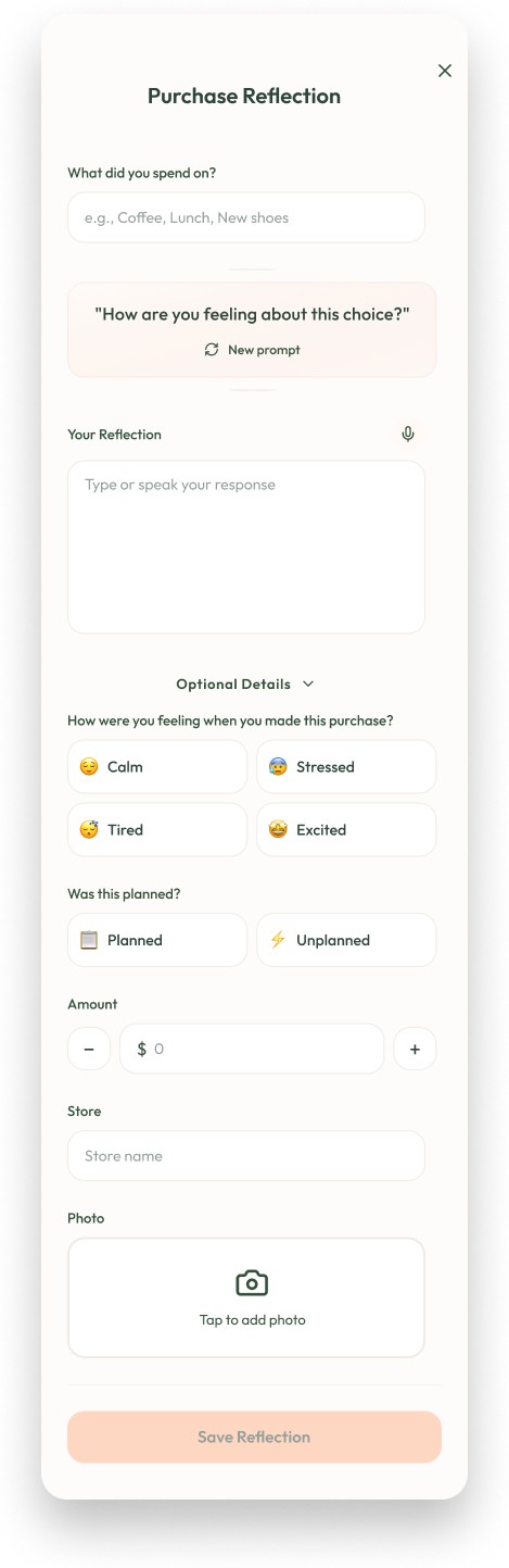 CTA “Purchase Reflection” was too narrow | Users weren’t sure if reflections applied only to purchases, and didn’t know how to reflect on no-spend days or mindful choices. | Renamed CTA to “Add Reflection” and added a No-Spend Reflection path to support daily habit formation. |