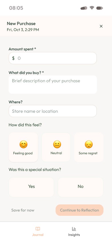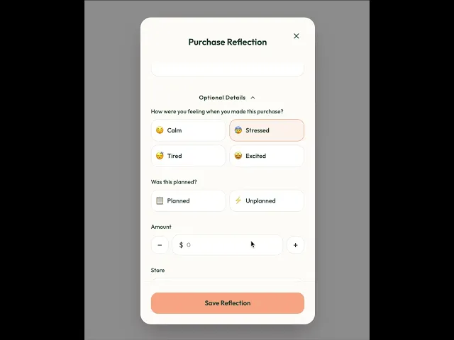 We evolved from a journal entry that revolved more on how much spent and category to focusing first on reflection and adding supplementary details about the purchase itself. In line with our hypothesis that the core utility of journalling for behavior change is in the writing itself - not in detailed accounting.